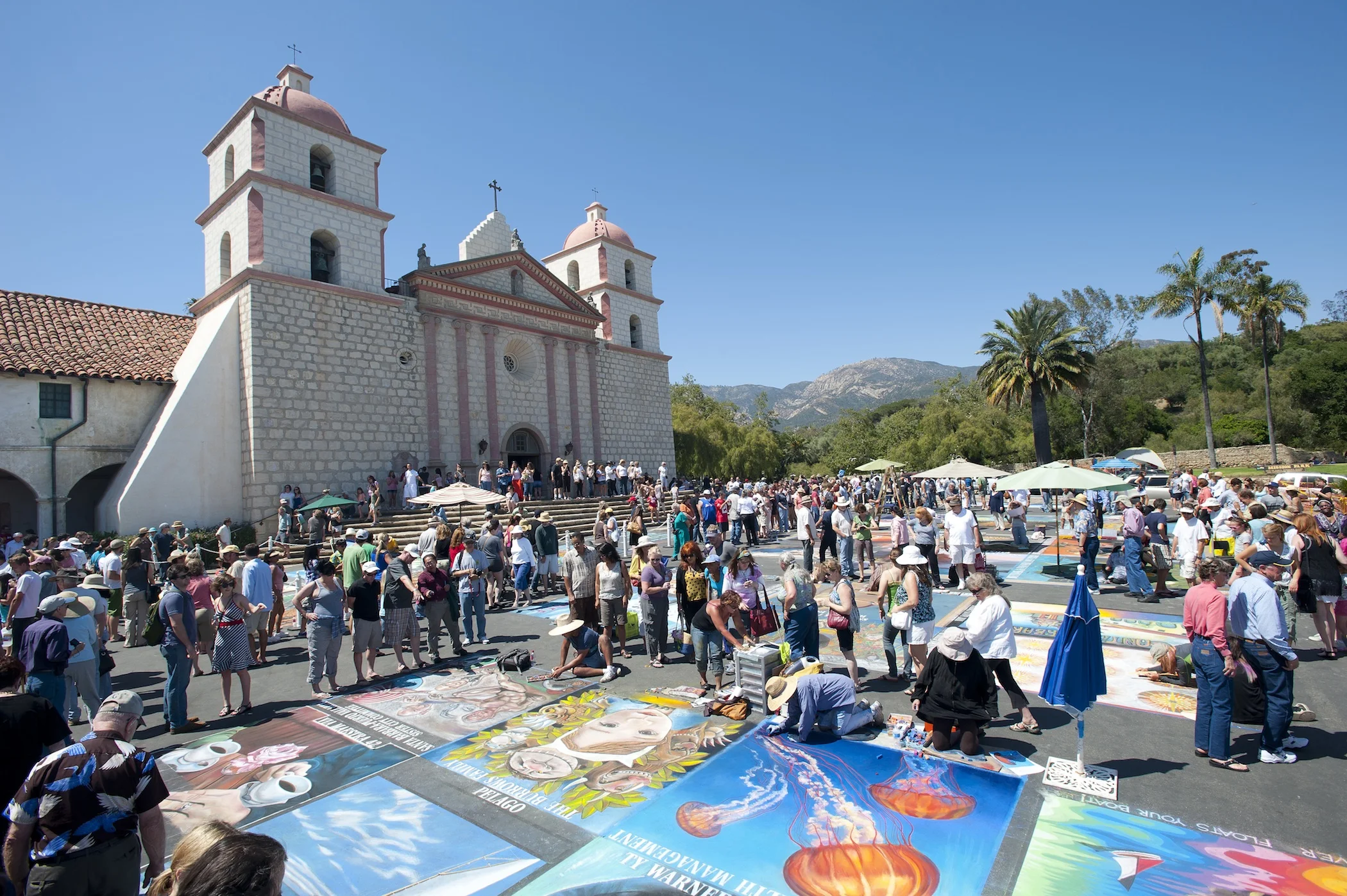I Madonnari is produced by the Children’s Creative Project (CCP), a nonprofit arts education program of the Santa Barbara County Education Office. The organization is the first to create a festival in North America featuring the public art of street painting. After traveling to a street painting competition in Italy, CCP Executive Director Kathy Koury created the festival and the concept of sponsored street-painting squares as a fundraiser and produced the first local festival in 1987. The late Father Virgil Cordano and the Santa Barbara Mission’s bicentennial committee members also worked with Koury to include the I Madonnari festival in the yearlong series of official events that celebrated the Santa Barbara Mission’s bicentennial.